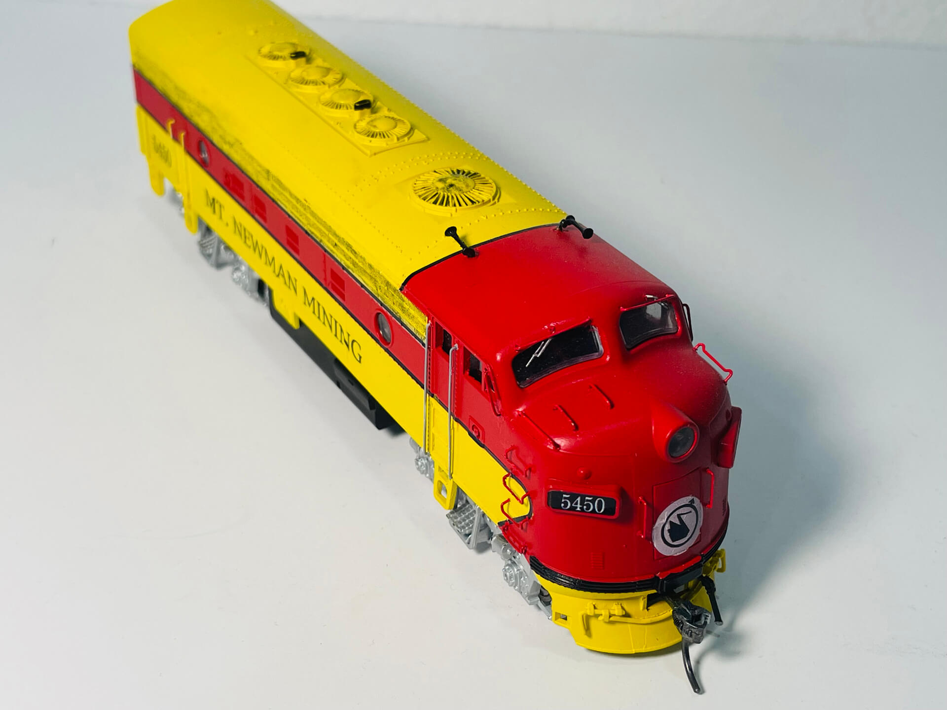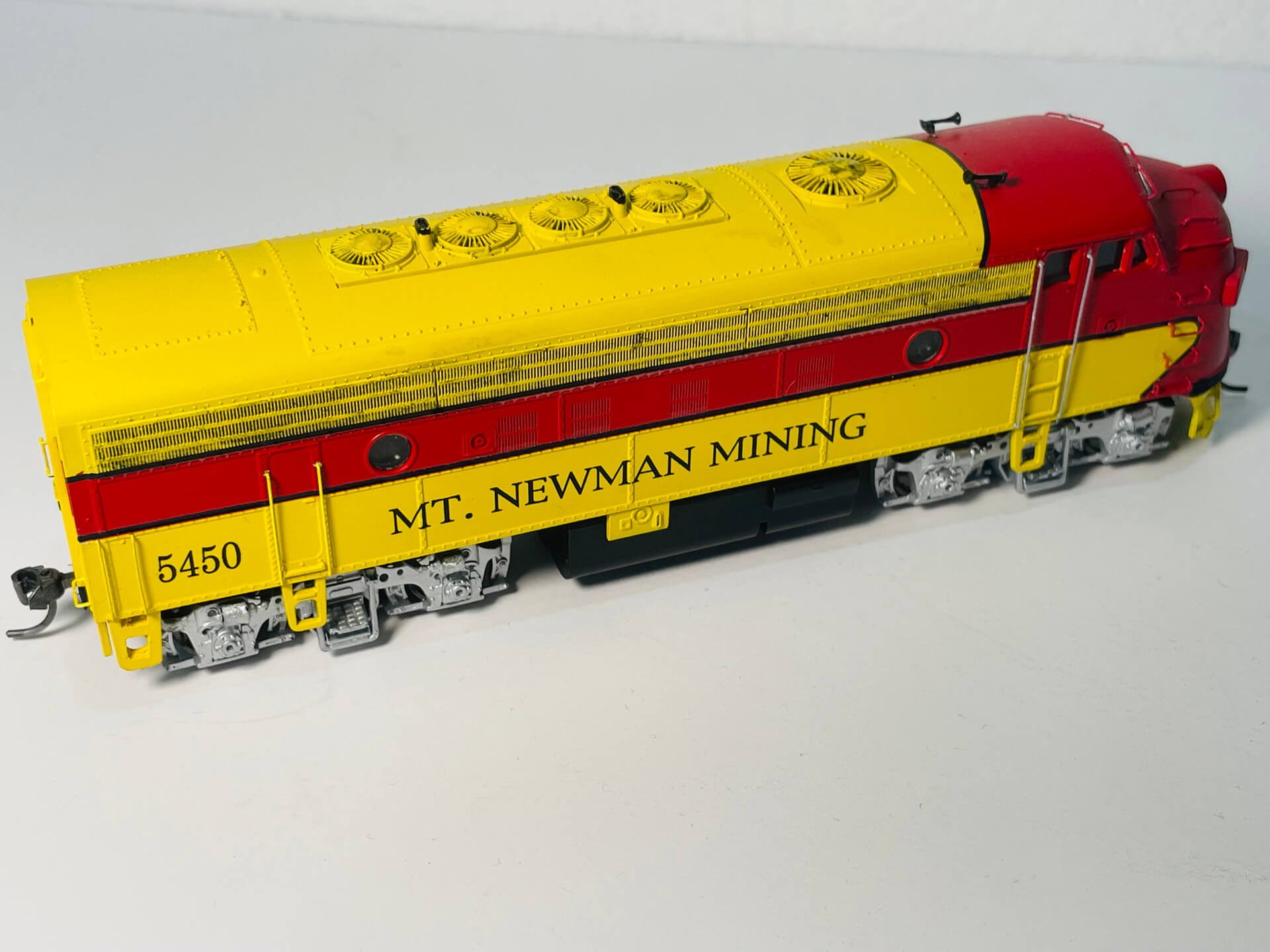 This EMD F7-A Model in Mount Newman Mining livery, represents the EMD 1.435mm gauge, B-B diesel-electric, 1,500hp locomotive built in 1950 for Western Pacific Railroad (USA) and purchased second hand in 1968 by Mt Newman Mining for railway construction work and is now stored at Six Mile Karratha (WA).