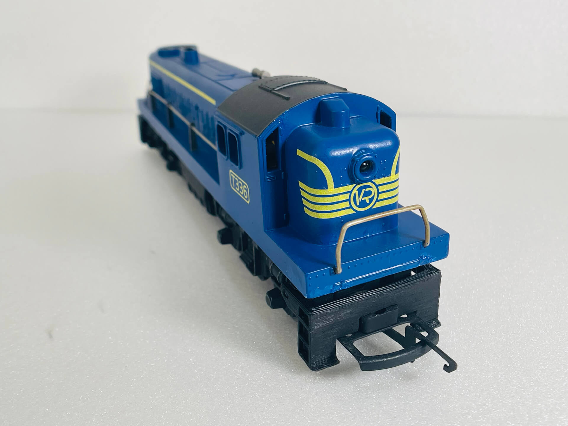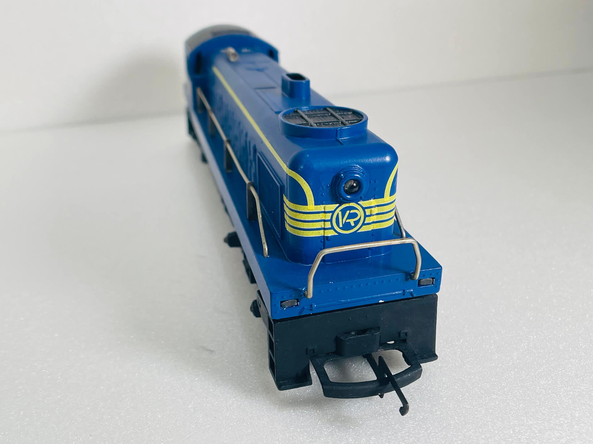 This diesel locomotive was made by Tri-ang, a company famous for producing affordable, plastic-bodied OO gauge model trains. This one is no exception (see images)! It was originally produced in the 1950's in various liveries with this variation V.R. Cat #: R.763 released in 1976.