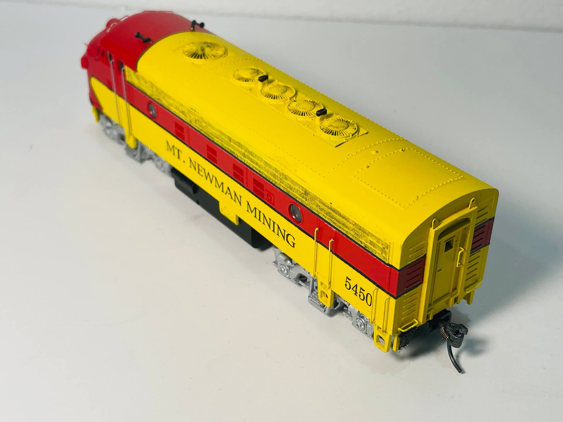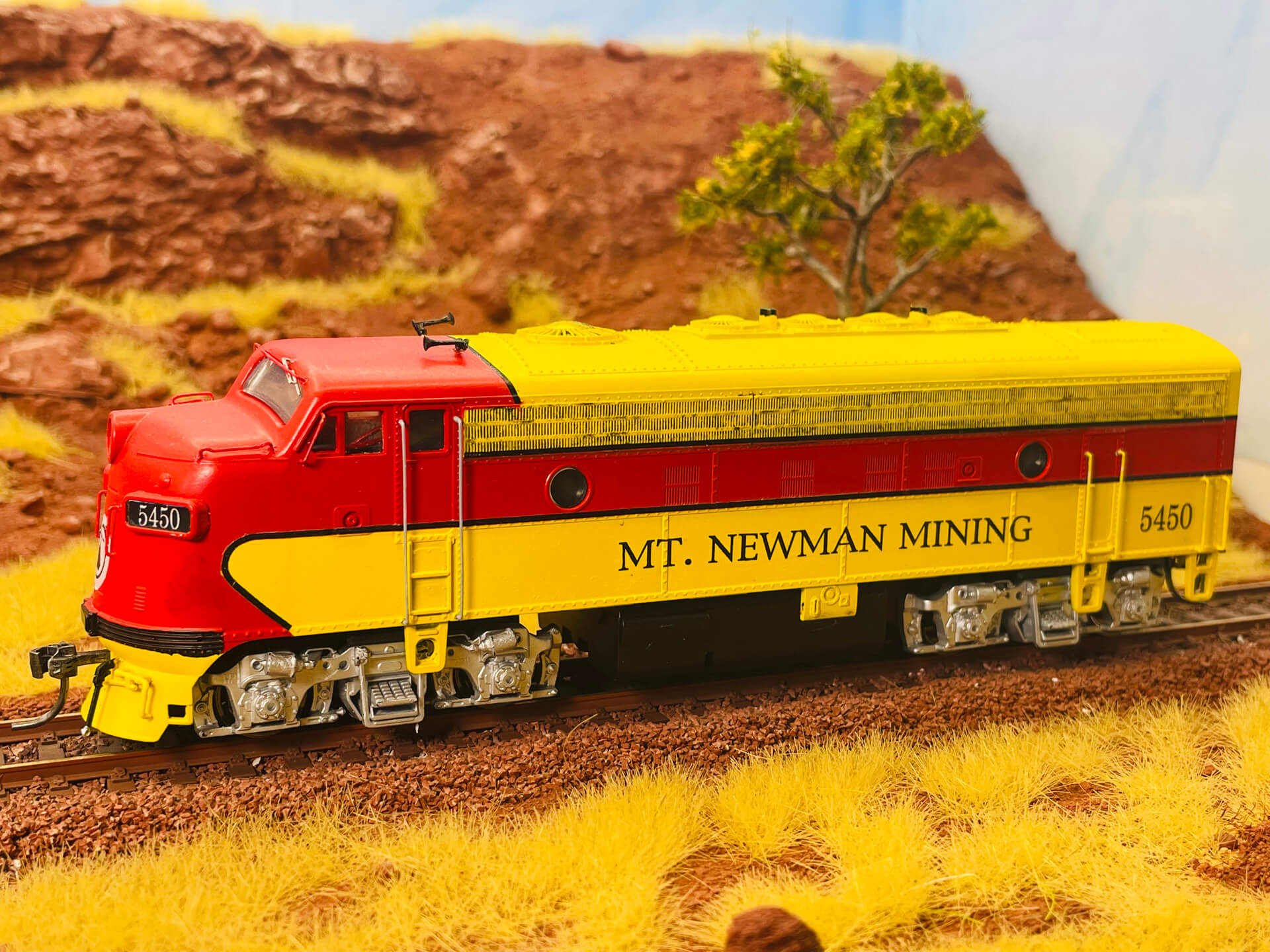 This EMD F7-A Model in Mount Newman Mining livery, represents the EMD 1.435mm gauge, B-B diesel-electric, 1,500hp locomotive built in 1950 for Western Pacific Railroad (USA) and purchased second hand in 1968 by Mt Newman Mining for railway construction work and is now stored at Six Mile Karratha (WA).