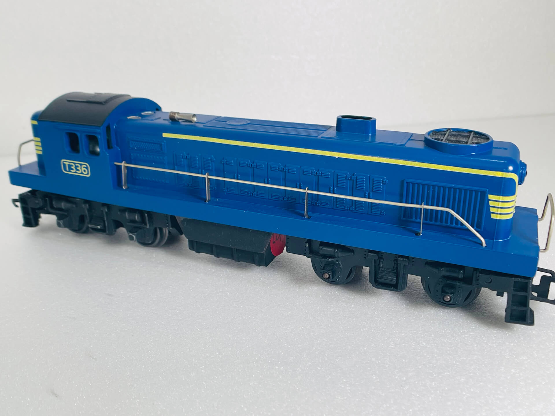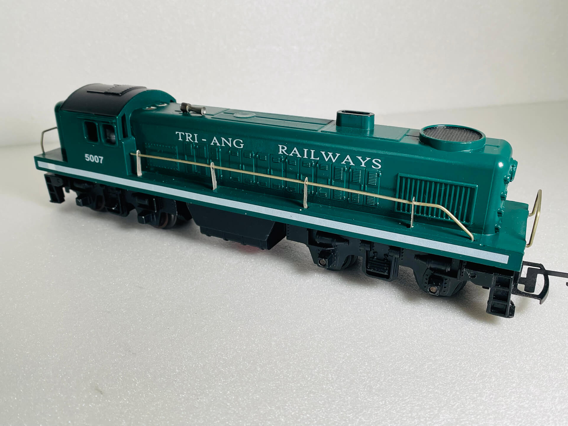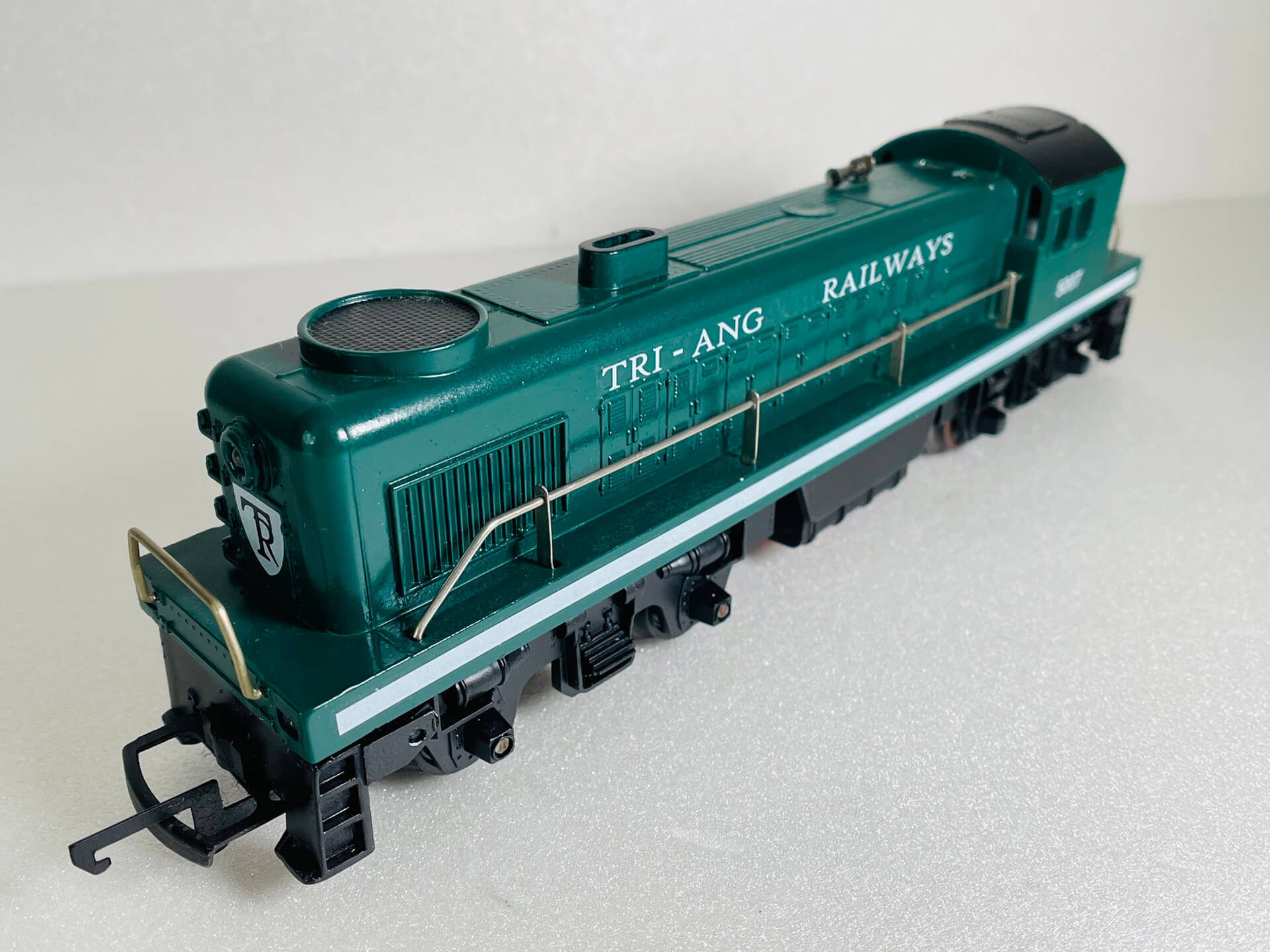 This diesel locomotive was made by Tri-ang, a company famous for producing affordable, plastic-bodied OO gauge model trains. This one is no exception (see images)! It was originally produced in the 1950's in various liveries with this variation T.R. 5007 R155 produced between 1957 & 1964. This particular model, has the body type 2 with sliding cab roof detail.