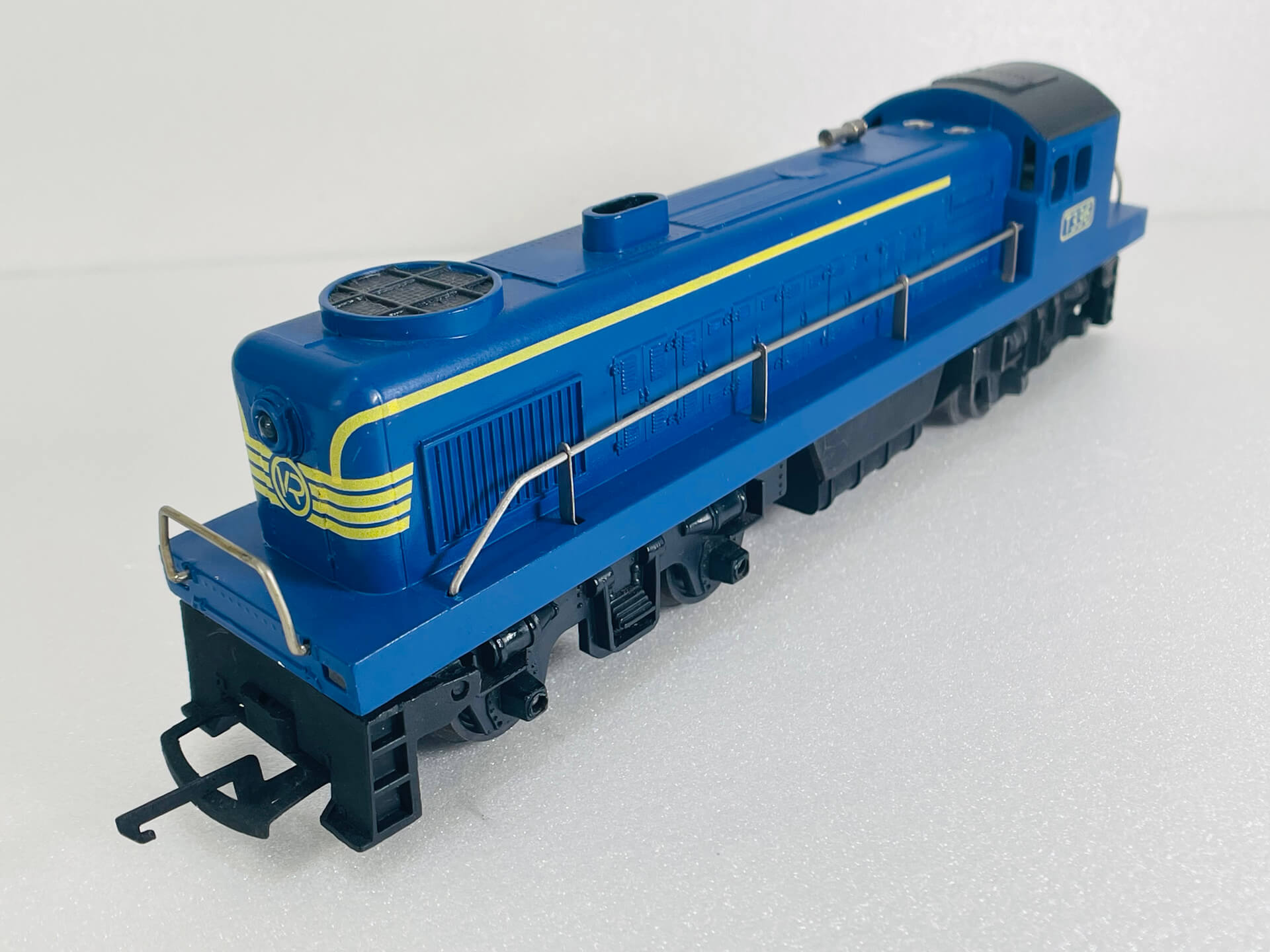 This diesel locomotive was made by Tri-ang, a company famous for producing affordable, plastic-bodied OO gauge model trains. This one is no exception (see images)! It was originally produced in the 1950's in various liveries with this variation V.R. Cat #: R.763 released in 1976.